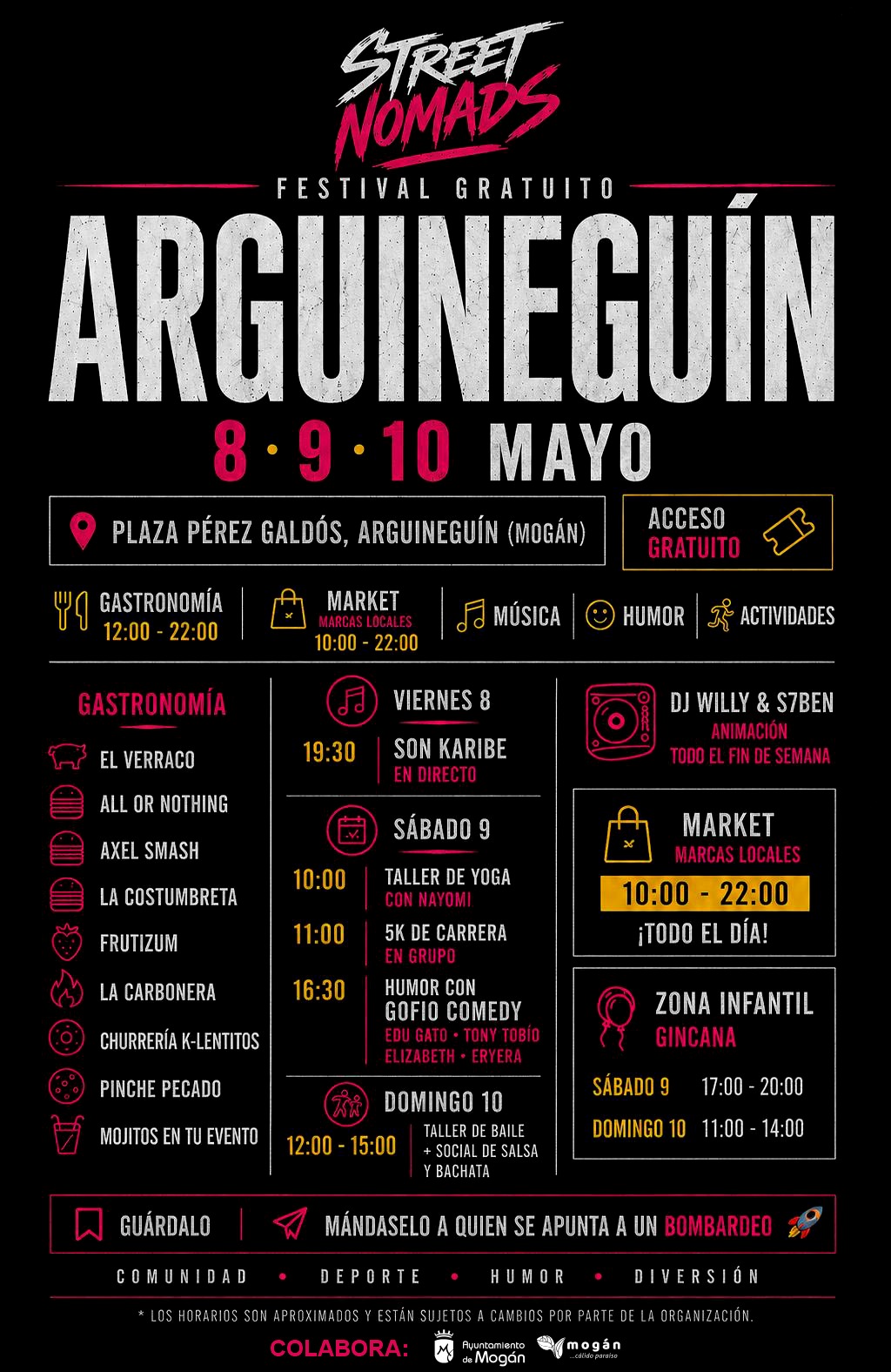La Plaza Pérez Galdós de Arguineguín será el escenario de la segunda edición del Street Nomads, un festival gratuito que se celebrará los días 8, 9 y 10 de mayo, reuniendo gastronomía, música, humor, deporte, actividades familiares y un mercado de marcas locales. El evento, de iniciativa privada, cuenta con la colaboración del Ayuntamiento de Mogán y está abierto a toda la ciudadanía