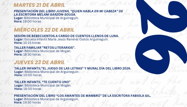 La conmemoración del Día del Libro en el municipio comenzará el lunes 20 de abril con el taller familiar “Retos literarios”, que tendrá lugar en la Biblioteca Municipal de Arguineguín a las 18:30 horas. Esta actividad invita a las familias a explorar la lectura desde el juego y la creatividad.