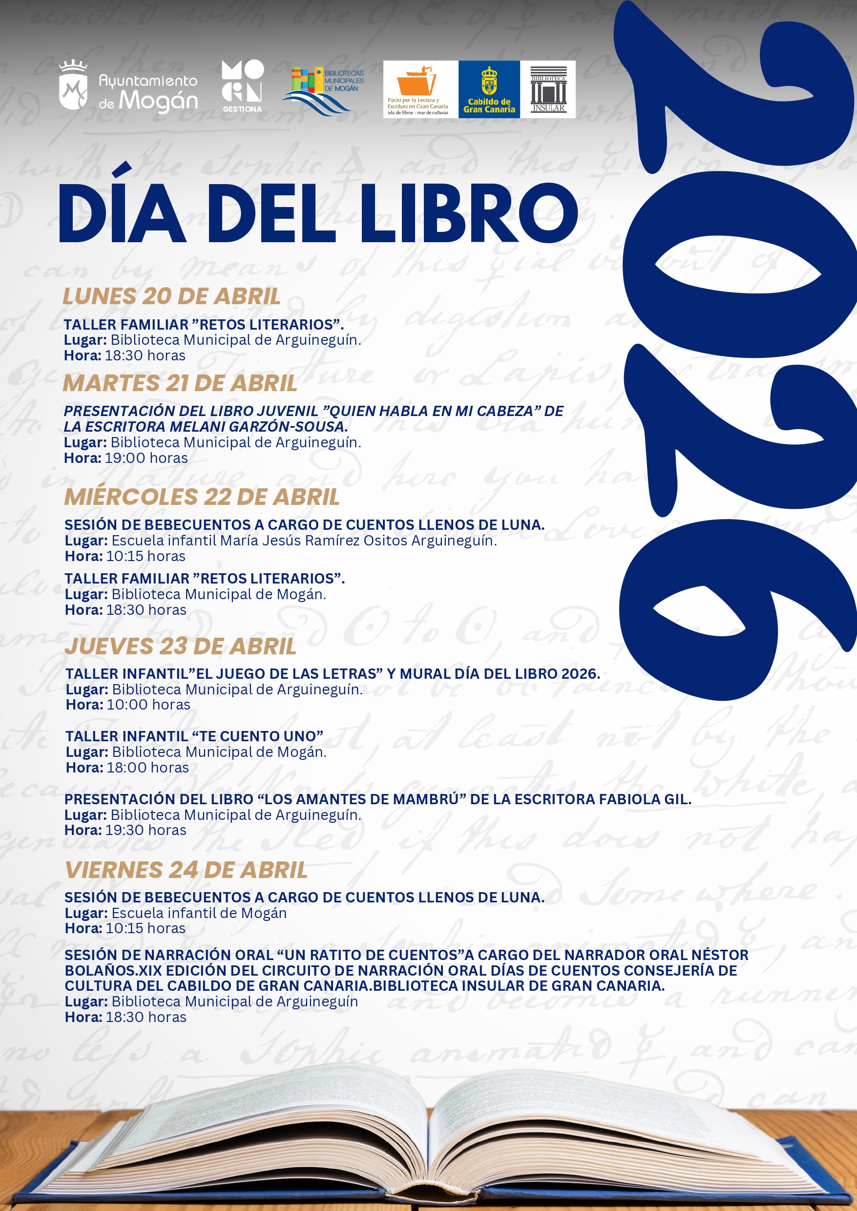 La Red de Bibliotecas Municipales de Mogán organiza una completa agenda de actividades del 20 al 24 de abril para celebrar el Día Internacional del Libro. La programación combina talleres creativos, presentaciones literarias, sesiones de narración oral y encuentros con autoras canarias