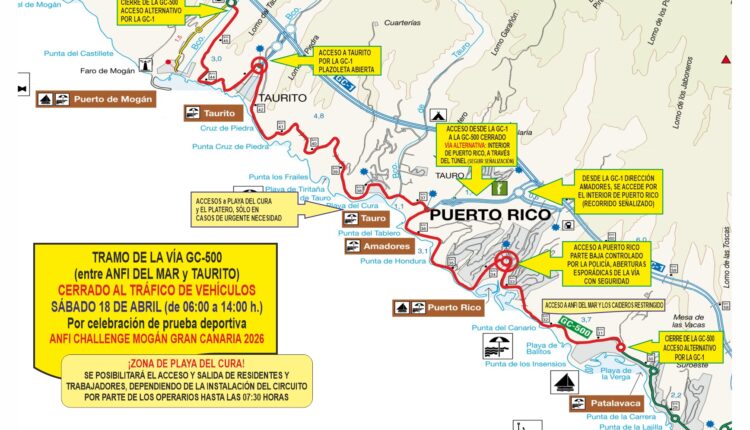 Los cortes y restricciones se producirán aproximadamente entre las 06:00 y las 14:00 horas del sábado 18 de abril con motivo de la celebración de la décima edición de la prueba de triatlón Anfi Challenge Mogán Gran Canaria. La carretera GC-500 se encontrará cerrada al tráfico de vehículos entre la plazoleta del barranco de La Verga –Zona de Anfi del Mar, punto kilométrico 30+700– y el barranco de Taurito, punto kilométrico 42+800