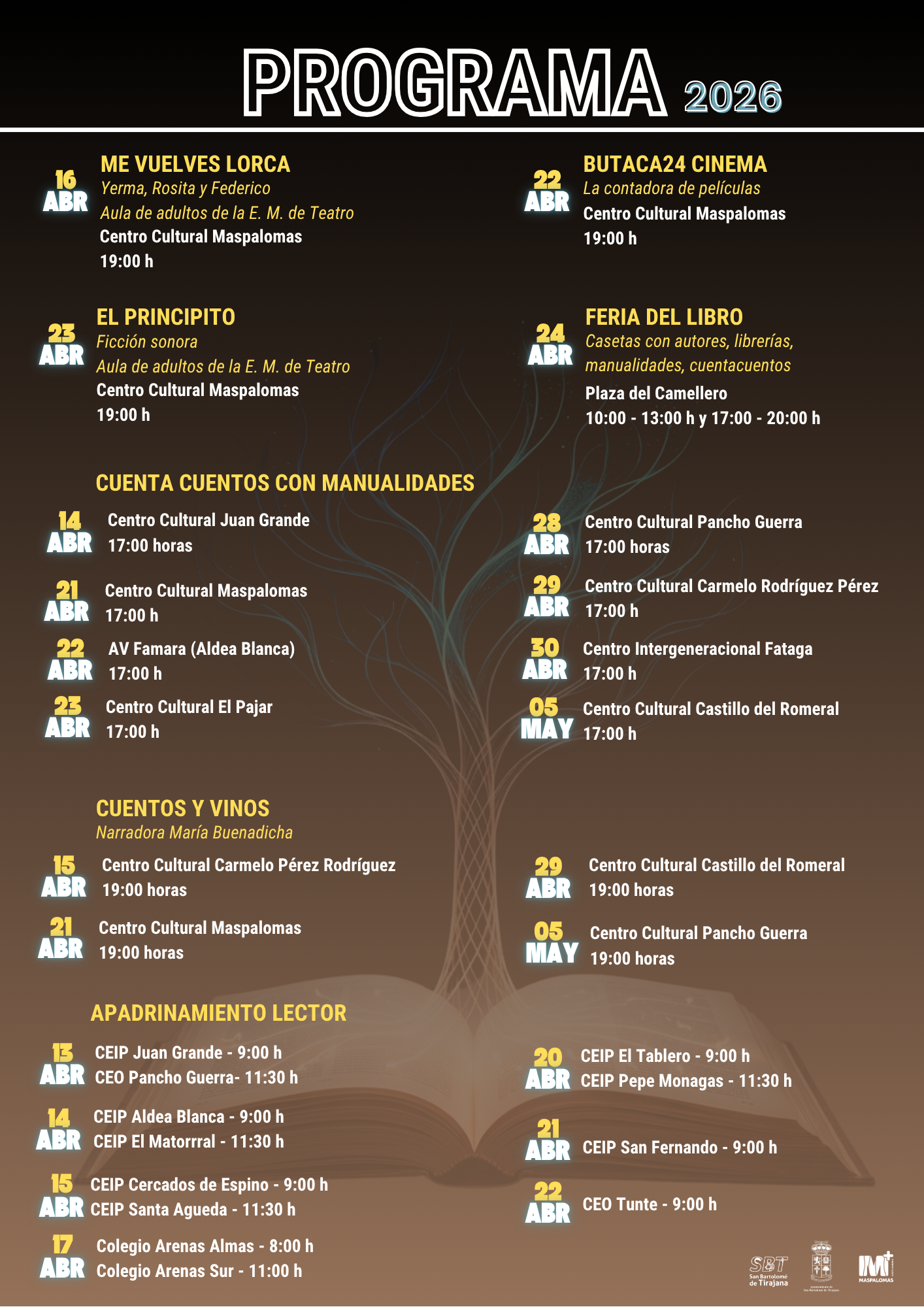 San Bartolomé de Tirajana celebra el Día del Libro 2026 con un extenso programa de actividades de animación a la lectura, que se desarrollarán durante este mes de abril y el próximo mes de mayo en los centros culturales y centros educativos del municipio.